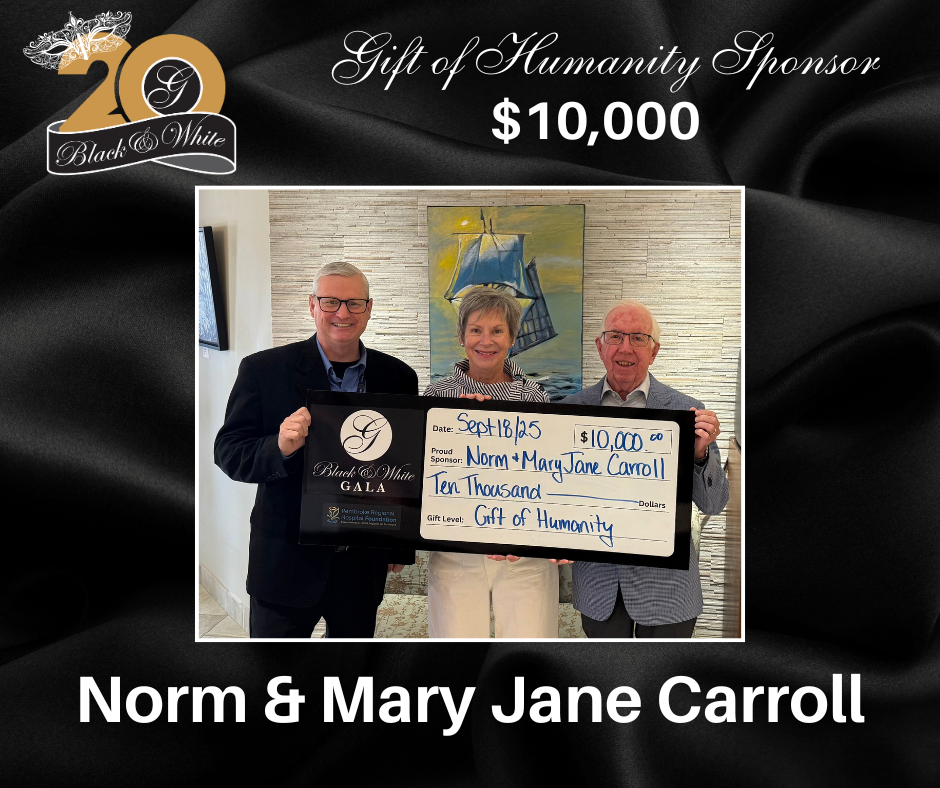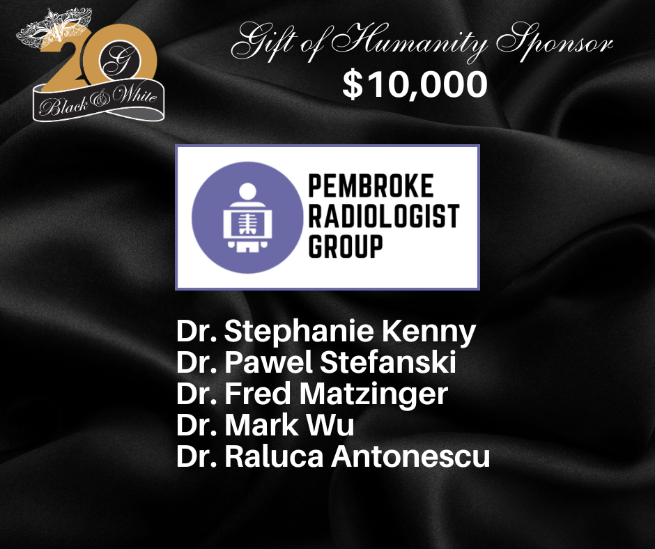 Mr. Martin presented the $20,000 Gift of Legacy Sponsors with a commemorative award, followed by the $10,000 Gift of Humanity sponsors; Parvati & Athena Events, The Murphy Family, Bergeron Clifford LLP, Norm & Mary Jane Carroll, Wally & Cathy MacDonell, Marion & Willie Ullrich, Carole Nevills & James Hooper and The Pembroke Radiologist Group. A special award of recognition was also presented to PRH Foundation Board Chair, Lisa Edmonds, for her decades of sponsorship, volunteerism and support of the Black and White Gala and the PRH Foundation as a whole.