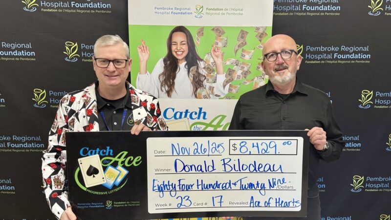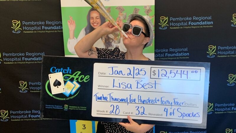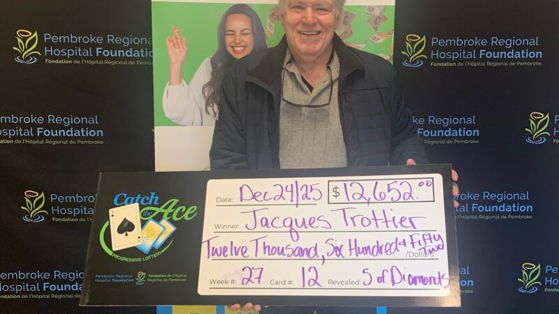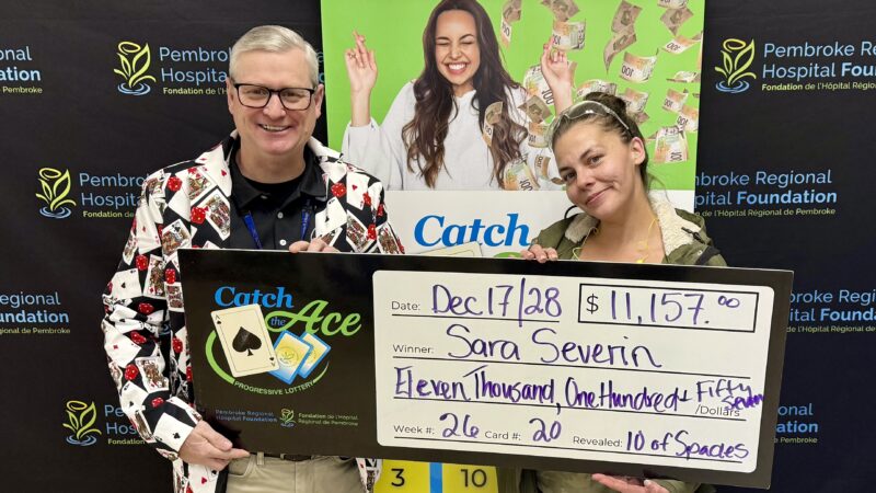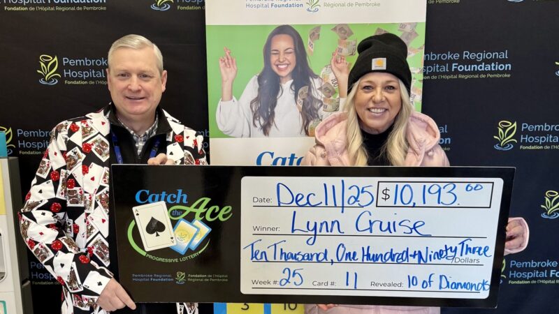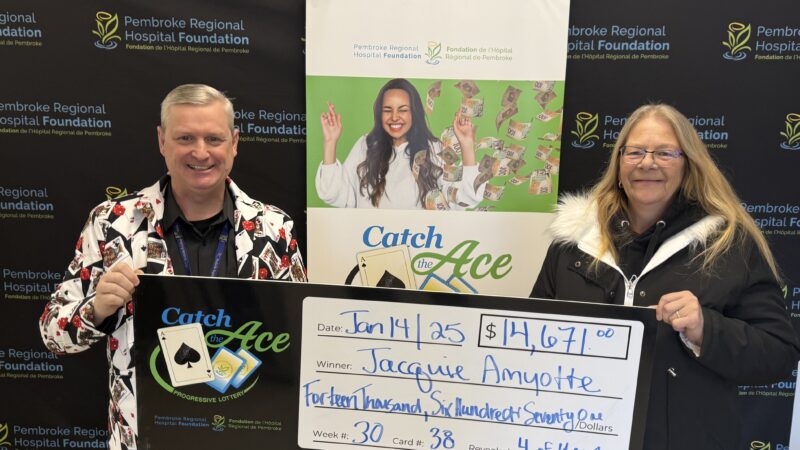 The Pembroke Regional Hospital Foundation is delighted to announce their Catch the Ace progressive jackpot raffle – Week 31 winner presented by OK Tire Pembroke! Congratulations to Barbara Phillips of Chalk River, on winning our weekly pot amount of $15,307.00, after her ticket #EE-28105656 and card #16, revealed the Queen