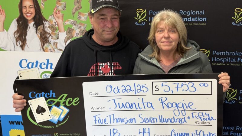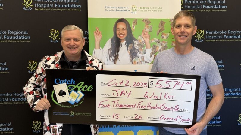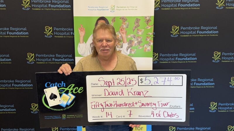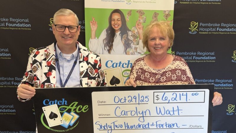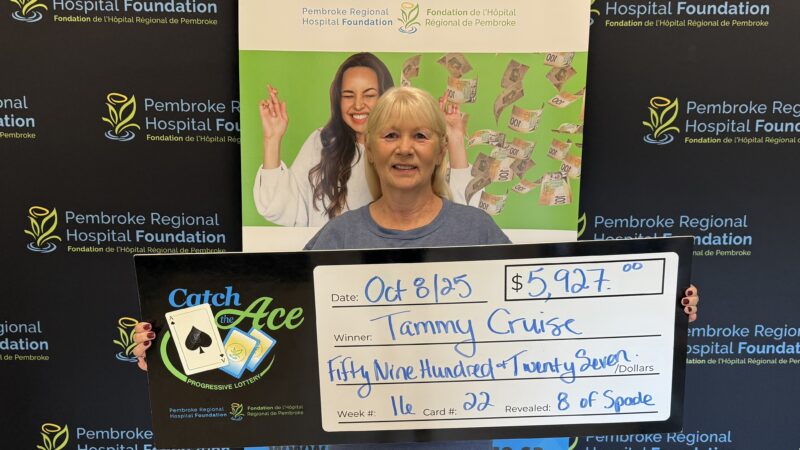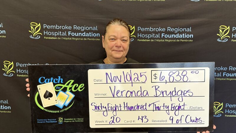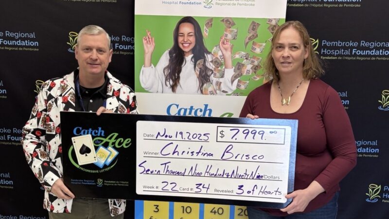 The Pembroke Regional Hospital Foundation is delighted to announce their Catch the Ace progressive jackpot raffle – Week 22 winner presented by OK Tire Pembroke! Congratulations to Christina Brisco, on winning our weekly pot amount of $7,999.00, after her ticket #V-12619688 and card #34, revealed the 3 of hearts after